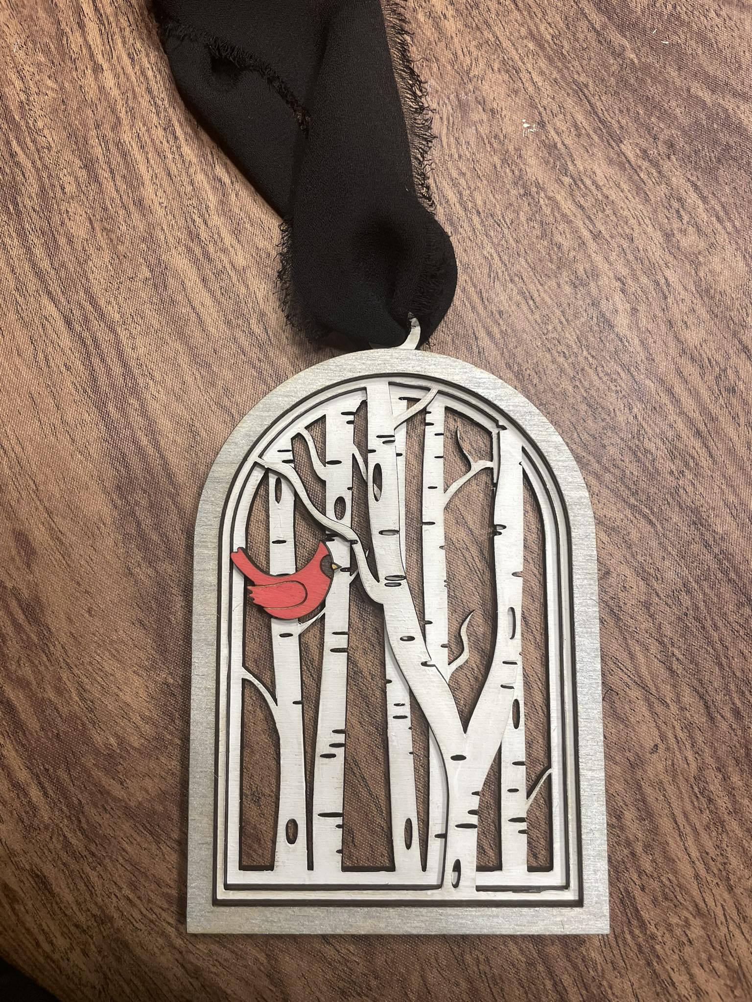 Peek through the window at this charming three-layer wooden ornament! A vibrant cardinal perches gracefully on delicate white birch trees, creating a cozy winter scene that brings nature indoors. Hand-crafted with dimensional layers, this piece captures the magic of a snowy day and makes a delightful addition to any holiday collection. Perfect for bird lovers and nature enthusiasts alike.