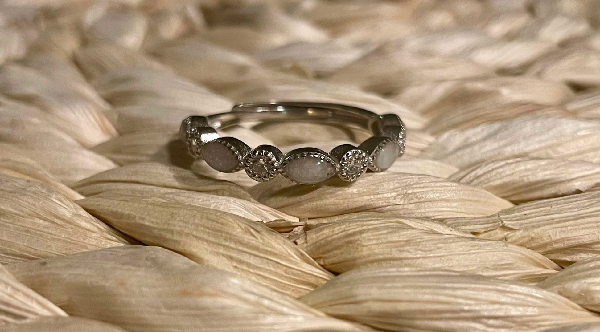 2x4mm sterling silver (S295) half band ring. Cremation ashes or breastmilk. Available in silver, rose gold (plated) or gold (plated). Adjustable size or set size (3.5, 4, 4.5, 5, 5.5, 6, 6.5, 7, 7.5, 8, 8.5, 9, 9.5, 10, 10.5, 11, 11.5, 12).