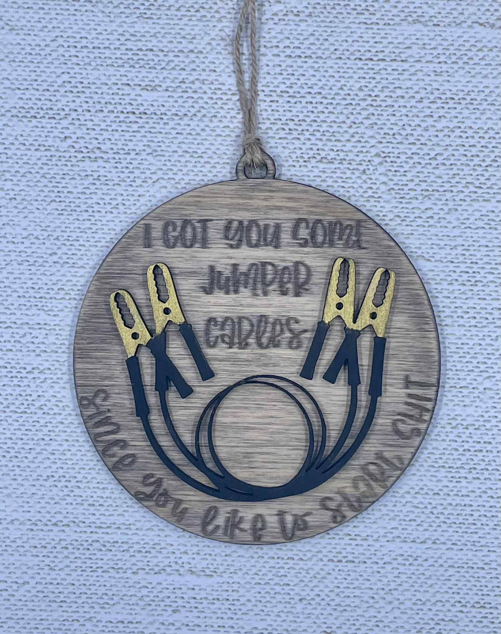 Perfect! Here's a playful product description for your jumper cables ornament: This cheeky Christmas ornament is the perfect gift for anyone who loves a good laugh and a clever inside joke. Featuring jumper cables with a witty message that'll get a smile every time it hangs on the tree, it's ideal for mechanics, car enthusiasts, or anyone with a mischievous sense of humor. A fun conversation starter that brings personality and personality to holiday décor.